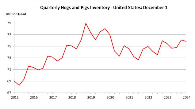 - U.S. hog producers intend to have 2.93 million sows farrow between December 2024 and February 2025, and 2.95 million sows farrow between March 2025 and May 2025.